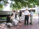 法轮功学员继续在纽约市中心進行反酷刑展,世人反应热烈。吸引了过往行人的极大关注,男女老少,纷纷驻足,看横幅,读图片,向学员了解事实,许多人主动走到签名桌前,排队要求签名。6月23-26日四天内有数千人签名要求中国停止对法轮功的迫害。
