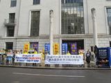 二零一九年十月一日,英国法轮功学员在伦敦中使馆前举行讲真相反迫害集会,揭露九月二十四日中共雇凶袭击香港法轮功学员廖秋兰并致其受伤流血的暴行,要求中共立即停止迫害法轮功,并呼吁广大中国同胞和国际社会在天灭中共的历史洪势下及时认清中共邪恶,在驱除共产主义恶魔的正邪交战中守住人类的善念良知,为自己选择美好未来 -