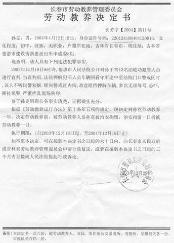 在那位法轮功学员家属的正义抵制下,恶警们虽然没取成假证,可他们知道他们的主子江××对待法轮功学员及其家属方面的不法政策,更不会阻止警察犯法,所以他们竟自己捏造事实,陷害民众。他们制造的莫须有的罪名是:“该人不听民警劝解,硬向警戒区内闯,故意阻挡押解车辆,多次无理辱骂、恐吓、撕扯民警,严重扰乱现场秩序。”以此借口非法劳教孙克一年。(见教养票)