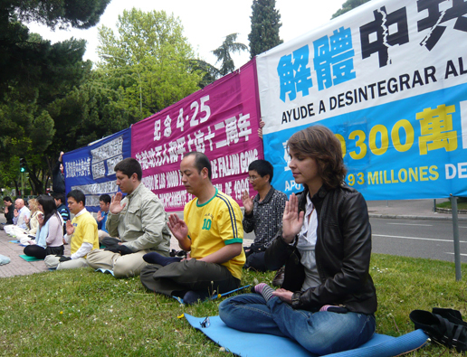 为纪念十二年前在北京发生的法轮功学员万人和平上访,西班牙法轮功学员于二零一一年四月十六日、二十三日分别来到驻西中使馆前和平抗议中共迫害。一位住在中使馆附近的先生在看过真相传单后说:“我原来就知道中共是一个非常残暴的独裁政府,自天安门大屠杀后,看到过不同的团体为了人权在这里抗议。为了让人们知道真相,伸张正义,你们做得很好。” -